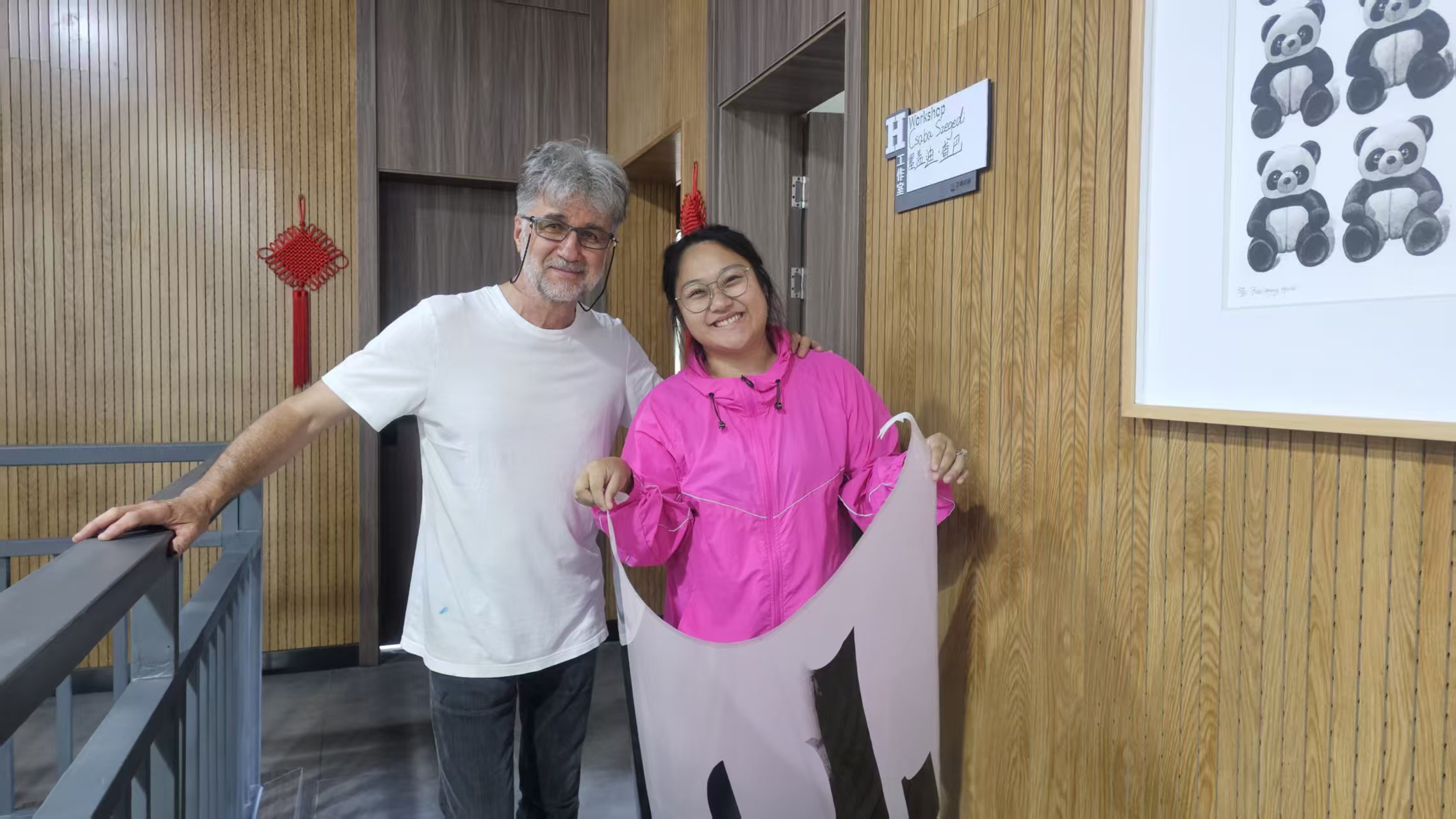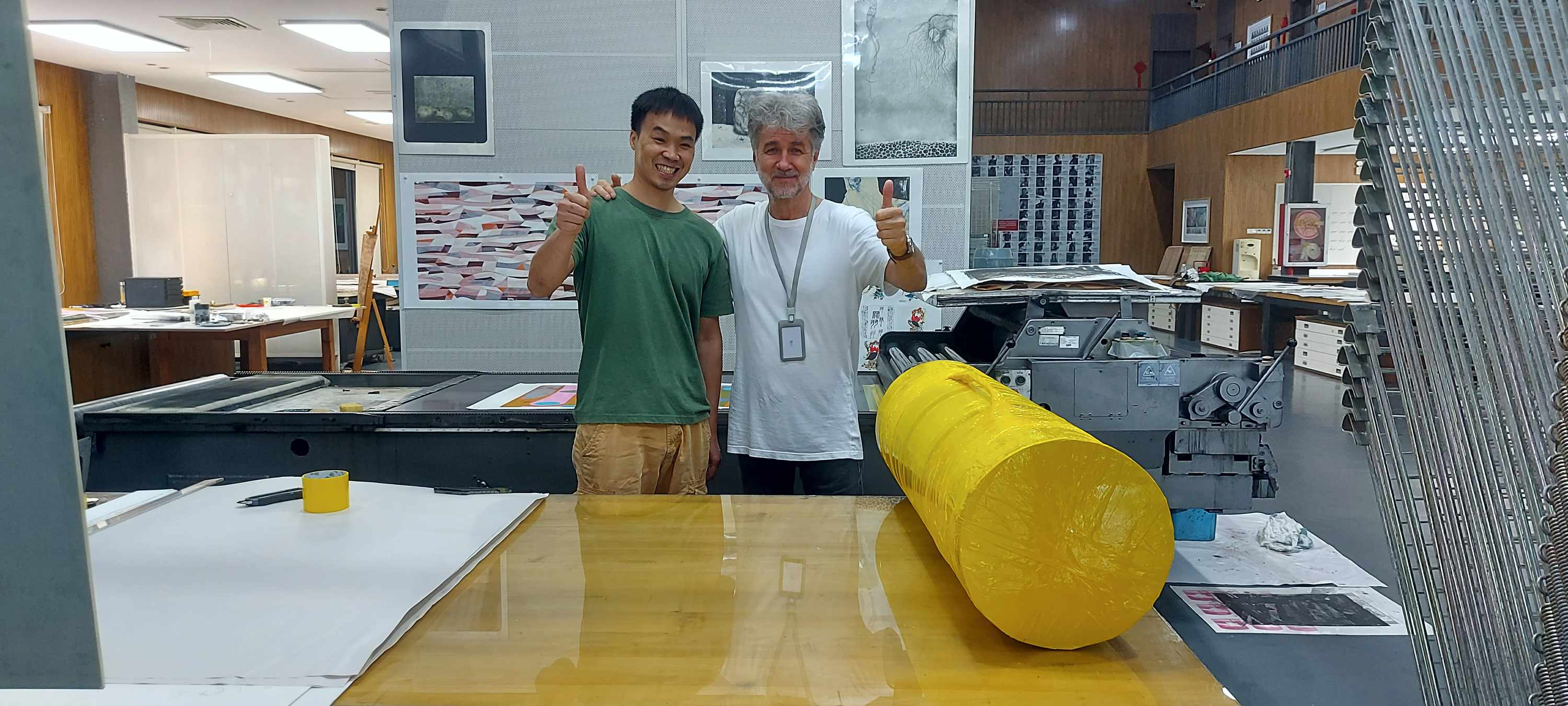 Chen Chaowei, expert staff member of the Guanlan Original Printmaking Base, and Csaba packing and preparing the finished prints for transportation.