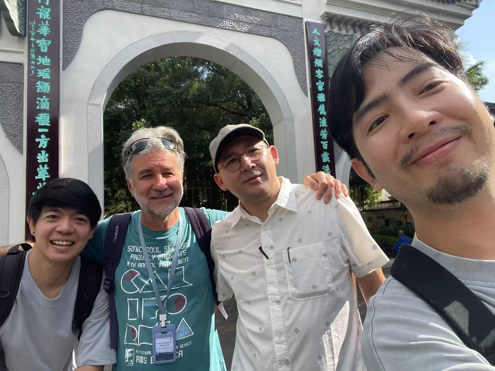 with resident artists Jitti Jumnianwai, Orlando Martinez Vesga and Praween Piangchoompu in front of the Main Gate of the Print Base